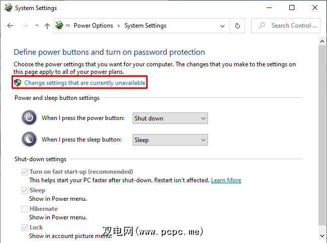 现在,选择选择电源按钮的功能,然后选择更改当前不可用的设置 >。
