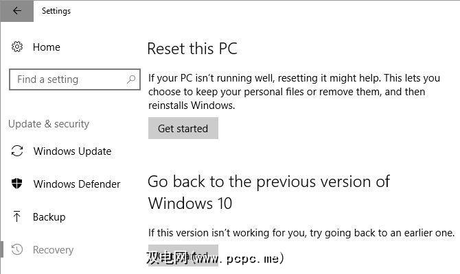 按 Windows键+ I 启动“设置"应用,然后转到更新和安全>恢复,然后在重置此计算机下,单击入门按钮。