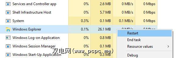 在过程标签中,搜索列表,直到您会找到 Windows资源管理器。然后,右键单击它,然后选择重新启动。