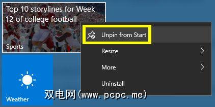 打开“开始"菜单,然后右键单击受影响的元素。点击从开始取消固定,将其从菜单中删除。