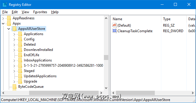 HKEY_LOCAL_MACHINE\SOFTWARE\Microsoft\Windows\CurrentVersion\Appx\AppxAllUserStore在左侧窗格中,右键单击在您之前记下的SID键上。点击删除,然后点击是进行确认。现在,重新启动计算机,看看问题是否解决。