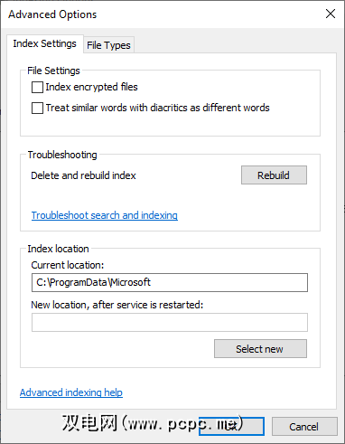 将出现“ Windows索引选项"面板。选择高级,然后在故障排除下,选择重建。