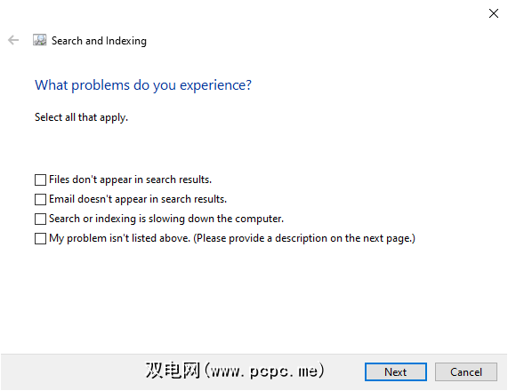 在故障排除下,选择搜索和索引故障排除。然后,您有四个选项: