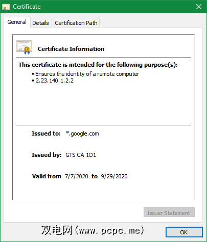 这将打开一个新窗口,其中包含有关站点证书的信息。在常规标签上,您可以查看证书的生效日期。在 Details (详细信息)选项卡上,单击 Subject Alternative Name(主题备用名称),您可以查看证书在哪些其他域上工作。