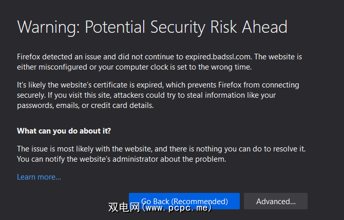 因此,您应该考虑发现此错误的网站类型。如果您看到来自银行或其他站点的带有有效信息的无效证书,请不要输入。您不想在不安全的网站上输入任何敏感信息。