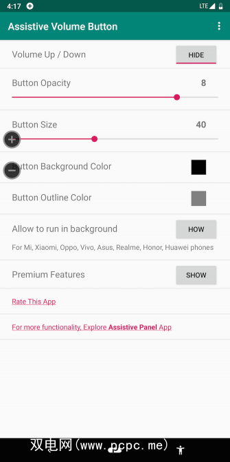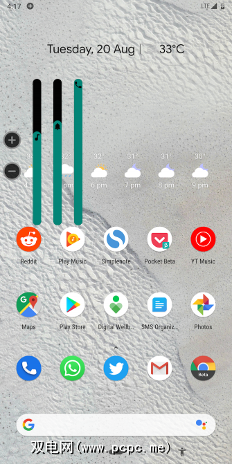 当您点击其中任意一个按钮时,会出现三个指示条,分别调节媒体,通话和通知音量。此外,您还可以自定义虚拟按钮的外观,大小等。