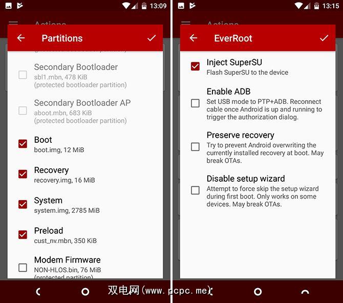 返回到“操作"屏幕中, EverRoot 将被列为操作。这将在刷新并安装SuperSU应用程序后尝试为您的手机建立根目录。如果您不想这样做,请点击它,然后取消选择注入SuperSU 。当一切看起来不错时,请点击 Flash 开始。