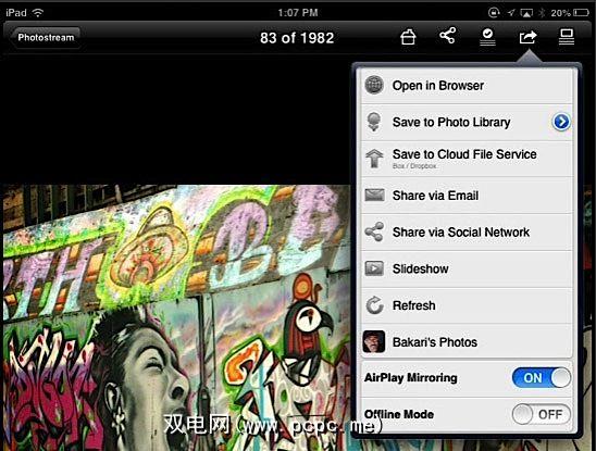您还可以横向浏览FlickStackr中的照片,该视图以两列视图打开,其中包含一组缩略图。左侧,选择的较大照片在右侧。点击主照片将使其进入全屏模式,并且两个菜单栏将滑出视图。在横向和纵向位置,您都可以在集合中的照片之间来回滑动,或以幻灯片形式播放它们。