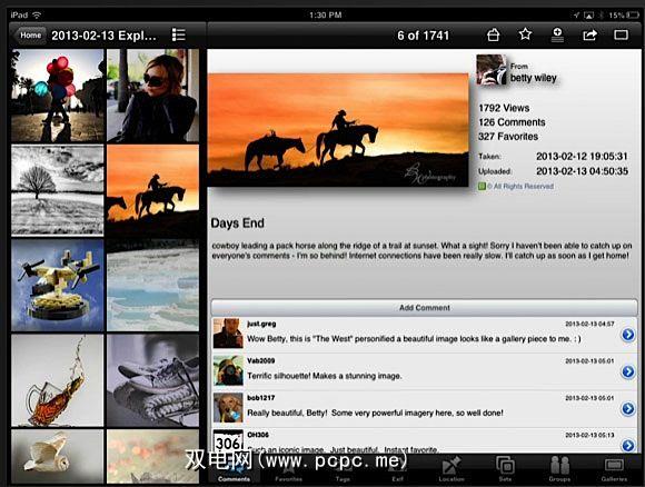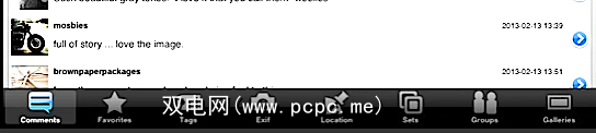 FlickStackr在应用程序的顶部和底部都包含菜单项,它们反映了大多数主菜单。网络版Flickr上的工具和功能。当您点击所选照片的右上角的``详细信息''按钮时,将出现底部菜单,用于添加评论和标签,查看其EXIF和位置数据以及所选照片所属的集合,组和画廊的列表。