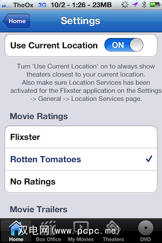 在Home部分的最底部,您将看到该应用程序的设置。在这里,您可以更改关联的帐户,选择电影分级的来源,允许和拒绝位置服务以及更改电影预览的质量。