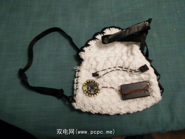 NeoPixels连接到具有3层导电线的Flora,电池,纽扣,Flora光传感器和Flora颜色传感器,并塞入钱包中并编织在纱线纤维之间。