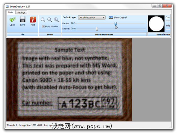 有关SmartDeblur的几处有用信息-有一个缩放选项以及 Fit to Window (适合窗口),您只需单击 Show Original (显示原始图片)即可将结果与原始图片进行比较,然后预览适用于整个图像,而不仅仅是一个小缩略图。 SmartDeblur附带有一个示例图像,您可以在其中学习如何对图像进行模糊处理以读取隐藏的文本。