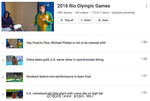 NBC Sports会定期更新奥运会的播放列表,如果您不想看到2016年奥运会以外的任何其他运动的剪辑。与任何非官方来源相比,剪辑的可靠性,英语评论和高质量的视频使其成为赢家。