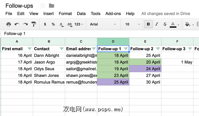 每一行都包含我向某人发送电子邮件的日期,他们的姓名,电子邮件地址以及计划的后续活动。如果我发送了一封后续电子邮件,则将单元格突出显示为绿色。如果后续行动得到回应,则以紫色标记。