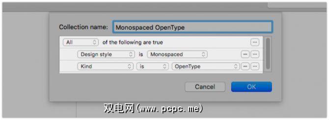 在我们的示例中,条件是 OpenType字体强>。您还可以使用其他条件过滤字体,最后以 OpenType格式的等宽字体结束。