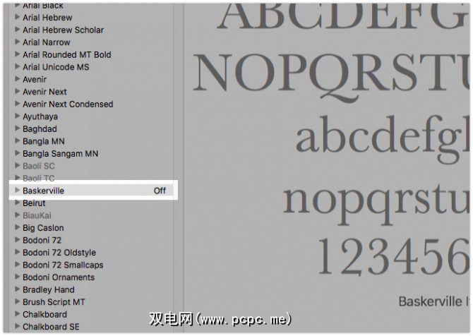 要禁用字体,请选择字体书应用中的字体,然后点击编辑>禁用。当出现确认对话框时,单击禁用按钮。完成后,您会在字体列表中看到标签旁边的 Off 。