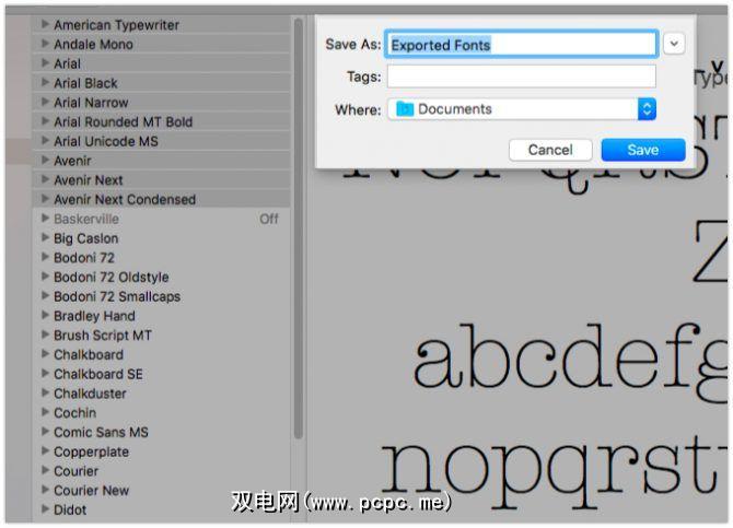 您可以在Mac之间移动字体,集合和库,方法是先将它们导出到文件夹。在要从中复制字体的Mac上的“字体簿"中选择一种或多种字体。接下来,使用 File> Export Fonts (文件>导出字体)选项将相应的文件发送到您选择的文件夹中。