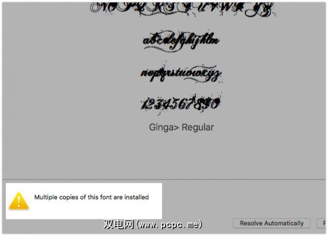 如果您选择的Mac上具有重复的文件的字体,则会在“字体簿"应用的预览部分中看到一个警告标志。如果字体的重复版本处于非活动状态或已禁用,您将不会看到警告。