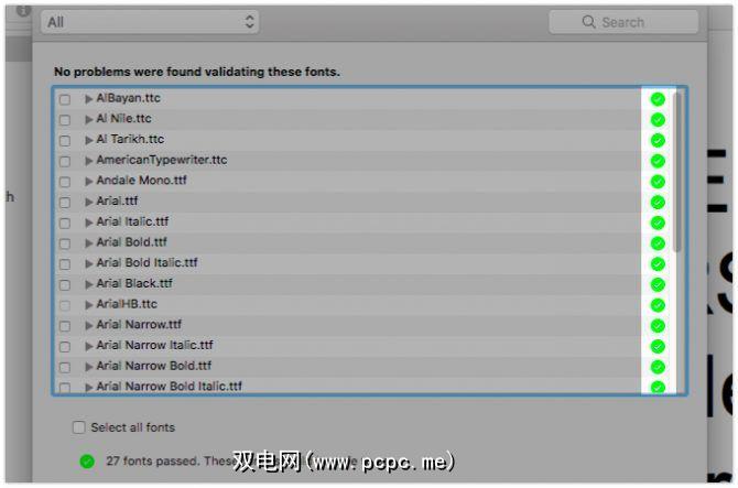 然后,应用程序会在旁边显示绿色对勾,以告诉您该字体是否可以安全使用。损坏的字体显示为红色的 X 。要删除标记为损坏的字体,请选中其复选框,然后单击窗口底部的删除选中的按钮。