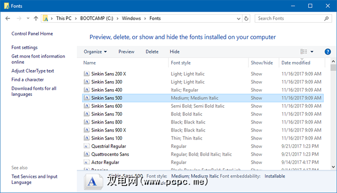 这是一个特殊的系统文件夹,它不会不能像普通文件夹一样工作,所以不要把它弄得太乱。重要的是要知道,您可以对字体进行排序,预览单个字体,删除不再想要的字体或将某些字体标记为隐藏,以便在使用应用程序(例如文本编辑器或Word)时它们不会出现在字体列表中