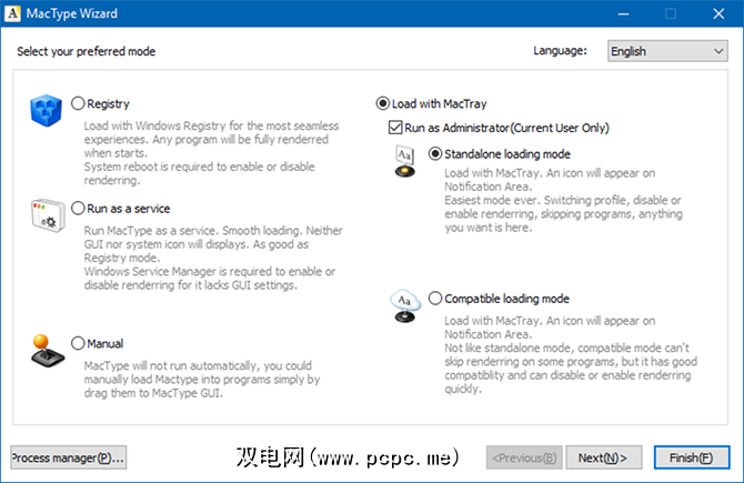 一旦安装,它会带您完成MacType向导的设置。我们建议选择使用MacTray加载(位于系统托盘中,并根据需要进行调整),并确保启用以管理员身份运行以及独立加载模式。