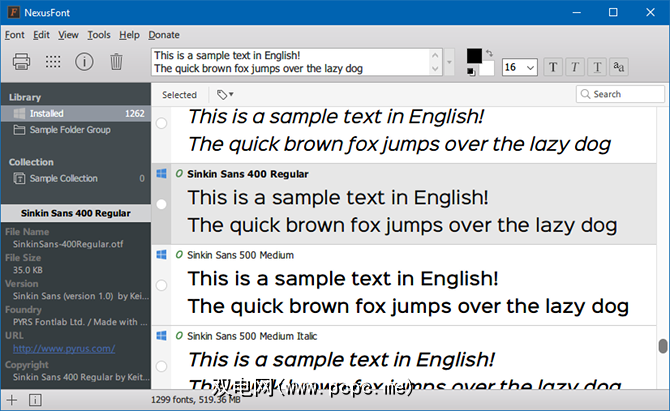 JungHoon Noh的NexusFont是一款便携式应用,可简化字体管理。您可以立即使用所有现有字体预览文本,更改预览文本和设置,删除不需要的字体,并将字体组织到文件夹和集合中。