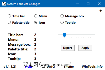 WinTools的系统字体大小更改程序是一款便携式应用程序,可以在Windows 10中调整六种不同的字体元素:标题栏,菜单,消息框,调色板标题,图标名称和工具提示。大小可以在0到20之间设置,字体可以是常规字体或粗体字体。