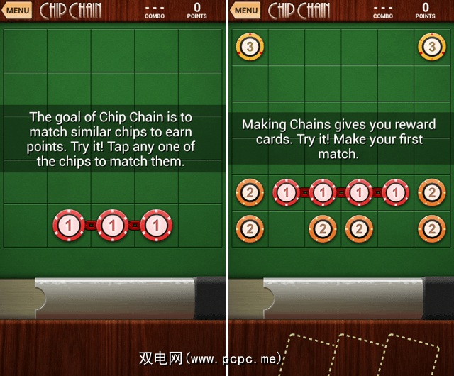 芯片链的前提很容易掌握:有一个空白可以被赌场筹码占据的网格(板)。每个筹码都有一个数字值,目的是在有三个或更多相同价值的筹码彼此相邻时清除它们。