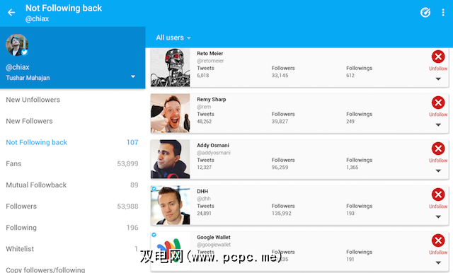 取消关注者向您显示了您关注的人,他们没有关注您,反之亦然,以及最近关注或取消关注您的人。它还有其他几个过滤器和功能,基本上可以将其转变为推荐引擎,以显示谁应该出现在Twitter时间轴上以及谁需要转储。