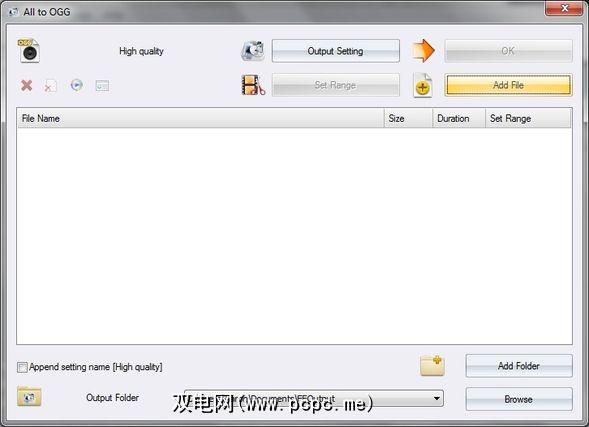 将弹出一个窗口,供您访问更改输出文件夹,调整输出设置,从特定文件夹目标添加特定文件类型的多个文件,以及通过Windows资源管理器窗口添加文件通过“ 添加文件"按钮。请注意,您可以通过按住shift键并选择要转换的文件来一次添加多个文件(此方法适用于您要选择的许多内容,而不仅限于Format Factory)。