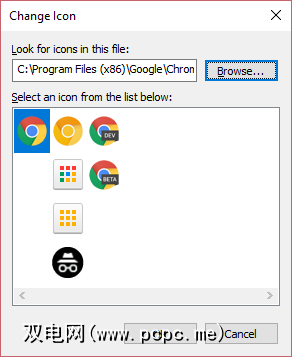 右键单击伪造的病毒批处理文件,然后选择发送到>桌面(创建快捷方式)。现在,转到桌面,右键单击新创建的快捷方式,然后选择属性>更改图标。浏览到您的Google Chrome目录(我的目录为C:\ Program Files(x86)\ Google \ Chrome),依次选择应用程序,然后选择Chrome.exe。按下OK 。