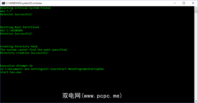 此恶作剧有多种变体。批处理文件可以很容易地编程为吐出一连串无意义或恶意的命令,这些命令显示在屏幕上,供受害者查看。在这方面,它是最有效的恶作剧之一,因为它看起来似乎正在发生重大的系统更改,这些更改已在命令提示符中提供。
