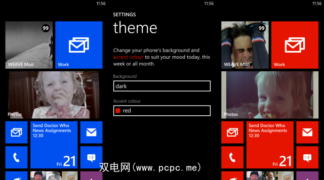 在Windows Phone 8中,您可以在设置>主题中更改手机的主题。在这里,背景可以设置为暗或浅,而强调颜色是用于瓷砖的颜色和可链接文本–也可以更改。