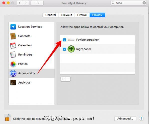 安装Faviconographer之后,您需要授予该应用程序使用Mac的权限。辅助功能。为此,请访问系统偏好设置>安全性和隐私>隐私>可访问性,然后选中Faviconographer旁边的框。