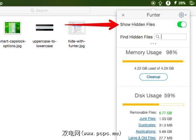 Funter允许您通过菜单栏图标和Finder工具栏图标显示隐藏文件。当然,后者只有在启用Finder集成后才可见,默认情况下为启用。