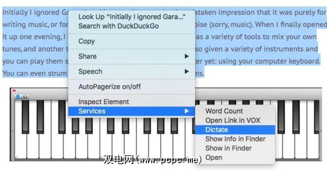 设置Dictater并将其启用后,您可以通过服务。要使用键盘快捷键加快操作速度,请转到系统偏好设置>键盘>快捷方式>服务>文本>听写。