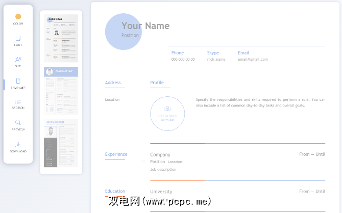 对于那些没有太多编写或格式化简历经验的人,简历生成器是一个不错的工具。它为不同类型的工作提供四个免费模板(最小,优雅,现代,时间轴),并指导您完成简历的设置。