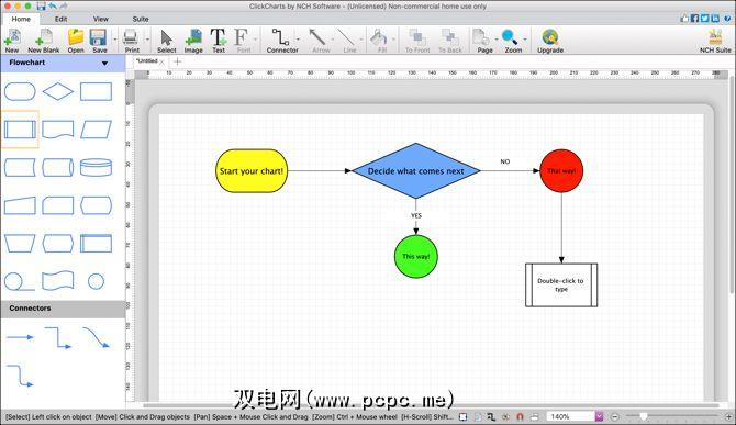 如果您不介意直接从网站上下载应用程序,那么一定要查看一下ClickCharts中的流程图。该应用程序的界面类似于Microsoft Word,其顶部的部分区域具有按钮和选项卡。选择要使用的一组形状,例如组织结构图,框图或流程图,然后单击以将其放在画布上。