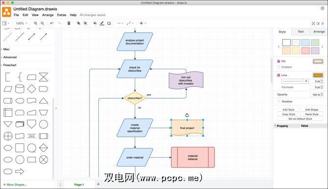 另一款值得您花时间的Mac免费流程图制作工具是Draw.io。您可以在线使用该应用程序,也可以将其下载到Mac。该工具还提供了一个简洁的界面,类似于您使用顶部的简单菜单和有用的侧栏所熟悉的应用程序。