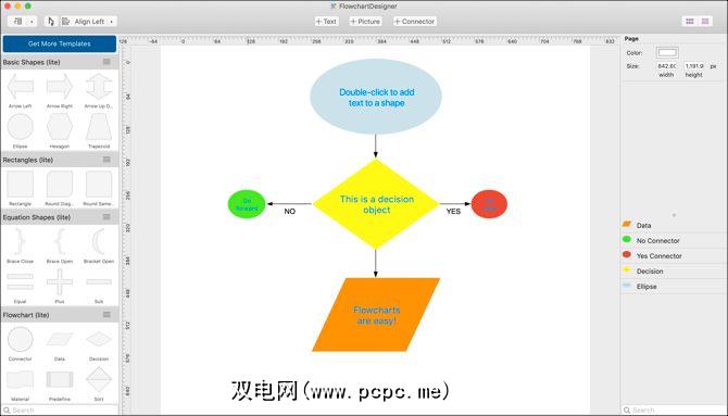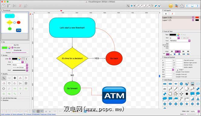 VisualDesigner是Mac上令人印象深刻的流程图制造商,其丰富的功能不花一毛钱。您可以从成千上万的形状和连接器中进行选择,每种形状和连接器都可以从其颜色,其大小到其文本进行自定义。