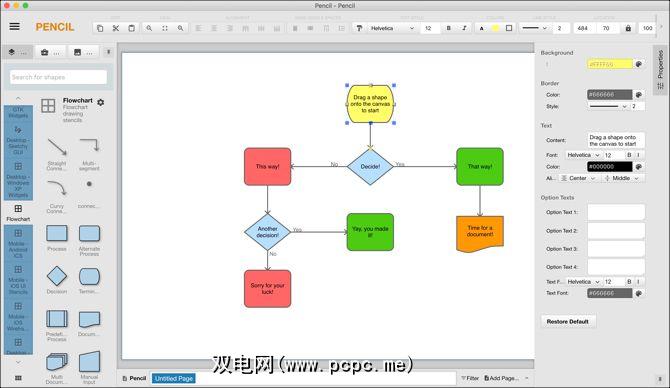 Pencil是另一个很酷的流程图应用程序,直接来自该公司的网站。打开后,您会看到一个漂亮的清晰应用界面和画布,可以使用。有一整套流程图对象,但是要使用该应用程序做更多的事情,您可以使用Web元素,小部件和移动模具。