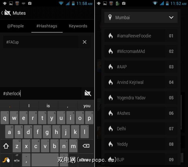 显示的图片还为Twitter搜索和热门话题提供了快捷方式。我对趋势主题界面感到非常失望。默认情况下,它会显示“全球趋势"主题,但是,如果您想知道您所在城市或国家的趋势,则必须手动滚动到该趋势,没有保存或快速搜索搜索的捷径。