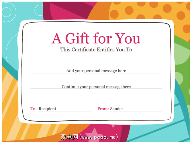 Microsoft Offices的此模板为您提供了具有鲜艳明亮色彩的礼物证书。对于成人或儿童,此娱乐选项是任何场合的绝佳选择。您可以使用礼物语言下方的顶部文本区域添加名称,网站或电子邮件地址,以根据需要自定义它。