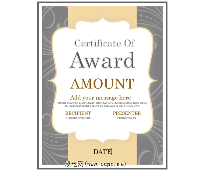 如果您要坚持使用全页礼品证书设计,这是Microsoft Office提供的一种外观精美且带有奖励主题的外观。您可以使用奖励金额或礼物,公司详细信息以及演示者和收件人轻松地对其进行自定义。这是员工认可奖赏或竞赛优胜者的不错模板,但可以针对任何类型的礼物进行编辑。