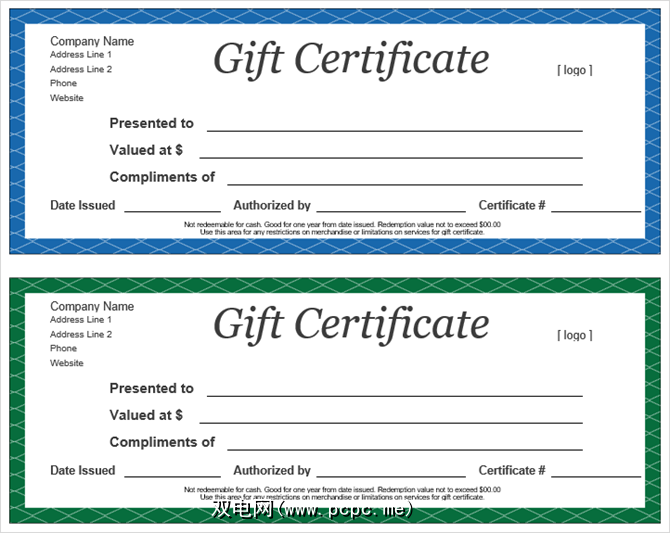 Vertex42有一个吸引人的模板,如果您希望在页面上显示三个。证书为您提供了很多详细信息,例如您的公司名称,地址,电话,网站和徽标。它还包括签发日期,授权者和证书编号区域。如果您有彩色打印机,则可以让客户在蓝色,绿色或红色边框选项之间进行选择。