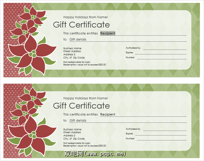 对于一个可爱的假期主题,Microsoft Office提供了此页面上的三页一品红模板。您可以使用实际地址填写姓名,也可以使用电话号码,电子邮件地址和网站。如果要打印这些内容,只需删除收件人和礼物详细信息文本并根据需要完成信息。