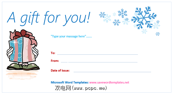 另一个可爱的节日礼物证书模板来自“保存Word模板",标题为“片状礼物证书"。在他们的网站上。这个有雪花和一个卡通人物拿着礼物。您可以在底部交换文本以包括自定义文本。另外,您可以使用顶部的位置键入个性化消息。