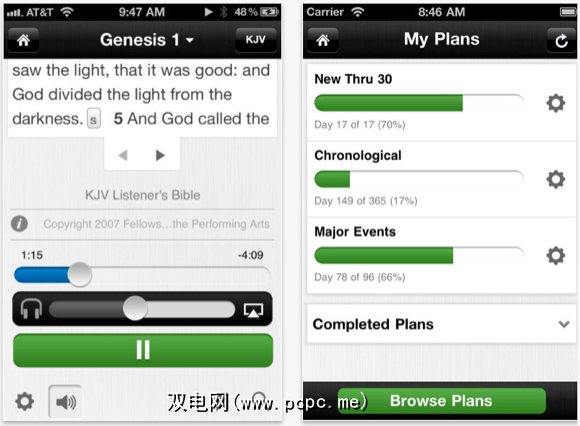 应用程序和网站都提供了各种圣经学习计划,用户可以在其中进行学习每天阅读选定的段落,将其标记为已完成。计划的类别包括灵修,部分和全部圣经学习,专题阅读以及为青年人特别选择的段落。