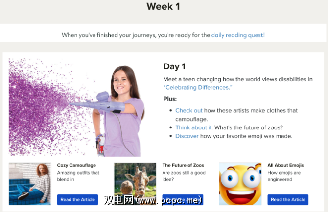 通常,孩子们必须阅读文章或观看视频,然后进行后续活动,例如根据他们所学的内容撰写文章。通过完成日常活动,孩子们可以获得“每日阅读任务",以提高他们的理解力。