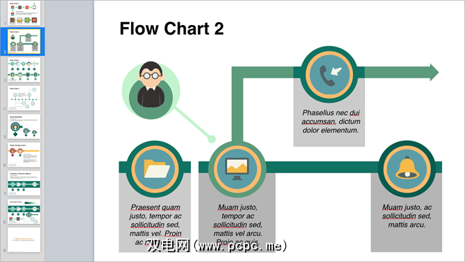 您的主题演讲需要流程图模板吗?这为您提供了几种幻灯片显示的流程图样式。